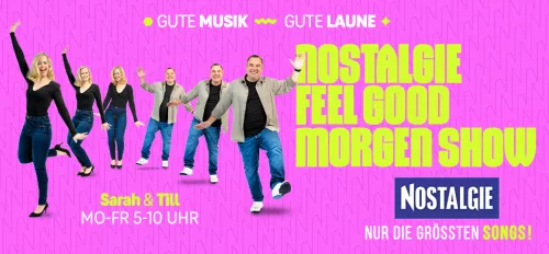 Die "NOSTALGIE Feel Good Morgen Show" hörst du immer montags - freitags von 5 - 10 Uhr mit Sarah und Till. Mit Musik aus den 70ern, 80ern und 90ern sorgen sie für den perfekten Start in den Tag.